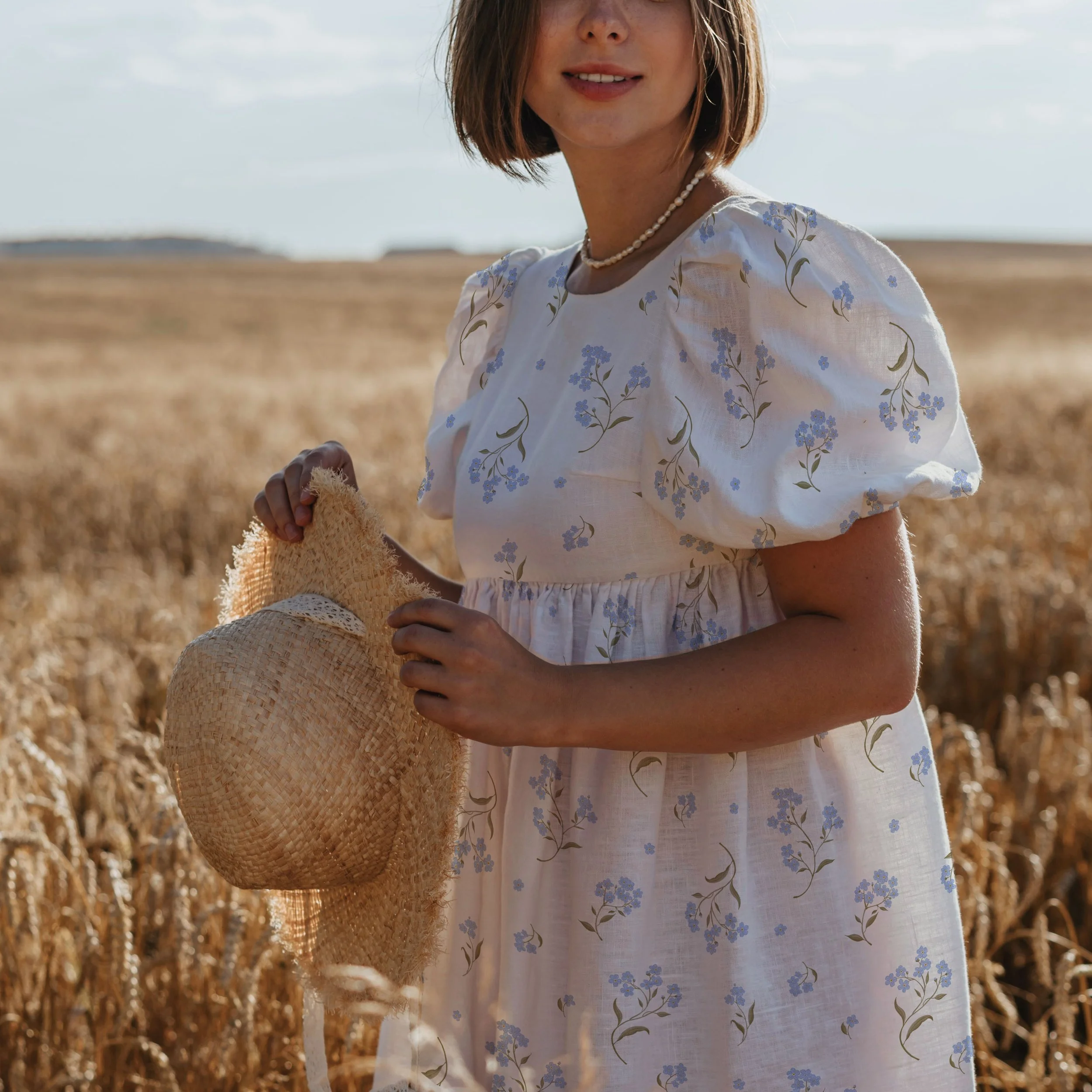 A seamless floral pattern featuring delicate watercolor forget-me-not blossoms in soft blue tones. Timeless and feminine, this design is perfect for fashion textiles, resort wear, and swimwear collections. Original illustration by Lily Sabbagh.