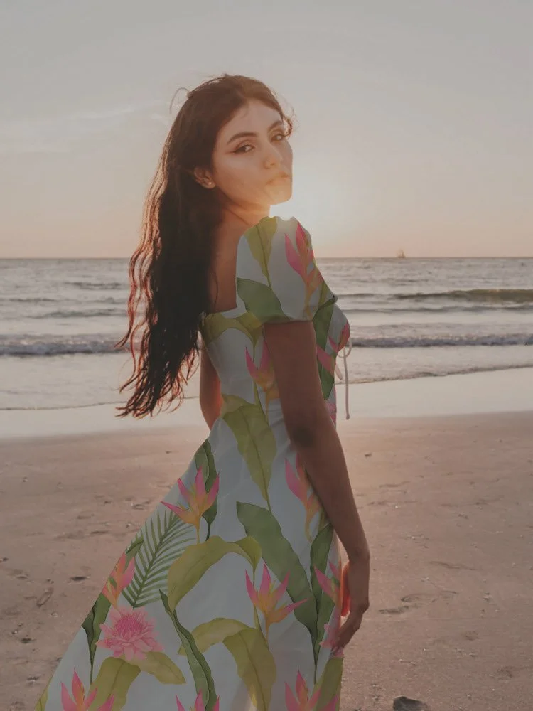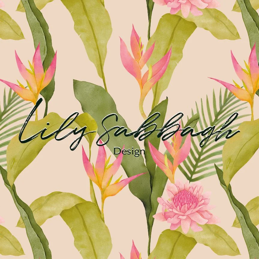A seamless tropical pattern inspired by the lush landscapes of Maui, Hawaii. Featuring watercolor botanicals, exotic foliage, and vibrant florals, this design captures the spirit of a paradise garden. Perfect for resort wear, summer textiles, swimwear, and tropical home décor. Original illustration by Lily Sabbagh.